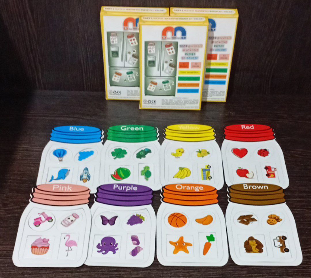 در بستهبندی این محصول، بطریهای مگنتی رنگی با طراحی جذاب به همراه مجموعهای از قطعات تصویری همرنگ قرار دارد که هر کدام متناسب با رنگ بطری انتخاب شدهاند.